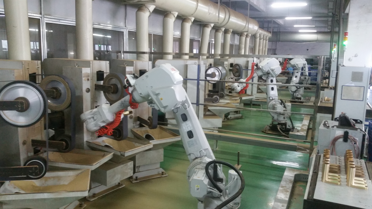 ? ? ? 打磨機器人系統配置四組砂帶機,砂帶機具備自動調速、自動糾偏、自動補償打磨力度等功能,適用于衛浴、電氣、家具、醫療五金工具等行業的打磨作業,并利用機器人的靈巧動作完成異形曲面五金件的打磨作業。