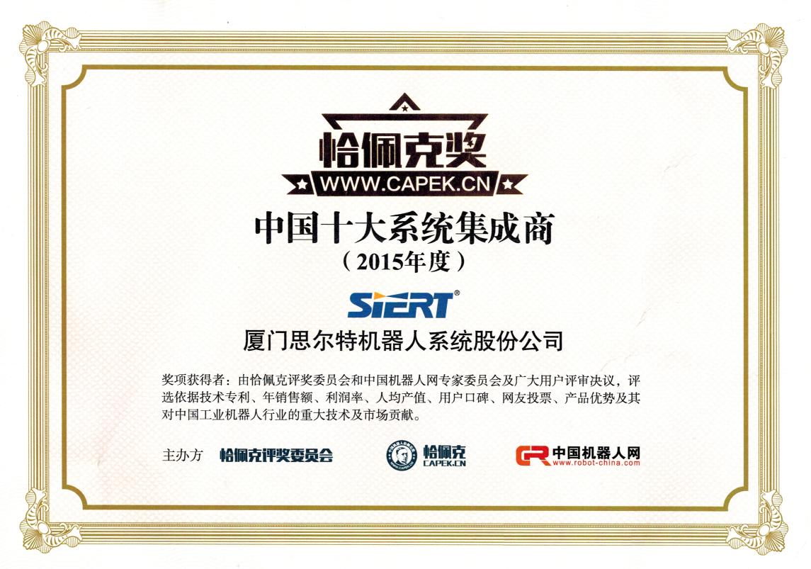 ?2015年1月15日,在中國機(jī)器人網(wǎng)主辦的第二屆機(jī)器人頒獎盛典上,廈門思爾特機(jī)器人系統(tǒng)股份公司榮獲“2015年度中國十大系統(tǒng)集成商”恰佩克大獎。