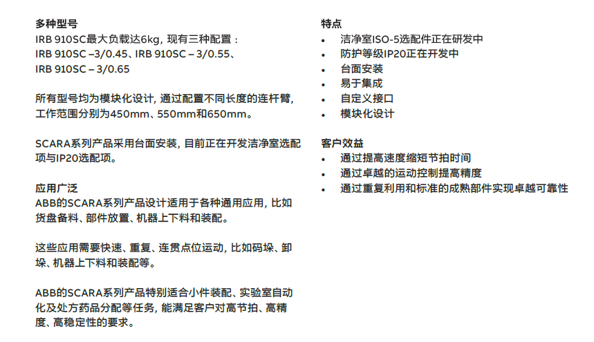 主要用途:IRB 910SC (SCARA) 機器人運行速度快、成本效益高;因為來自ABB,所以更精準。在設計選擇順應性關節型機器人手臂(SCARA) IRB 910SC時,ABB旨在提供一款能夠在有限空間內大展身手的機器人,ABB的SCARA機器人系列是小件裝配、物料搬運和零件檢測的理想之選。
