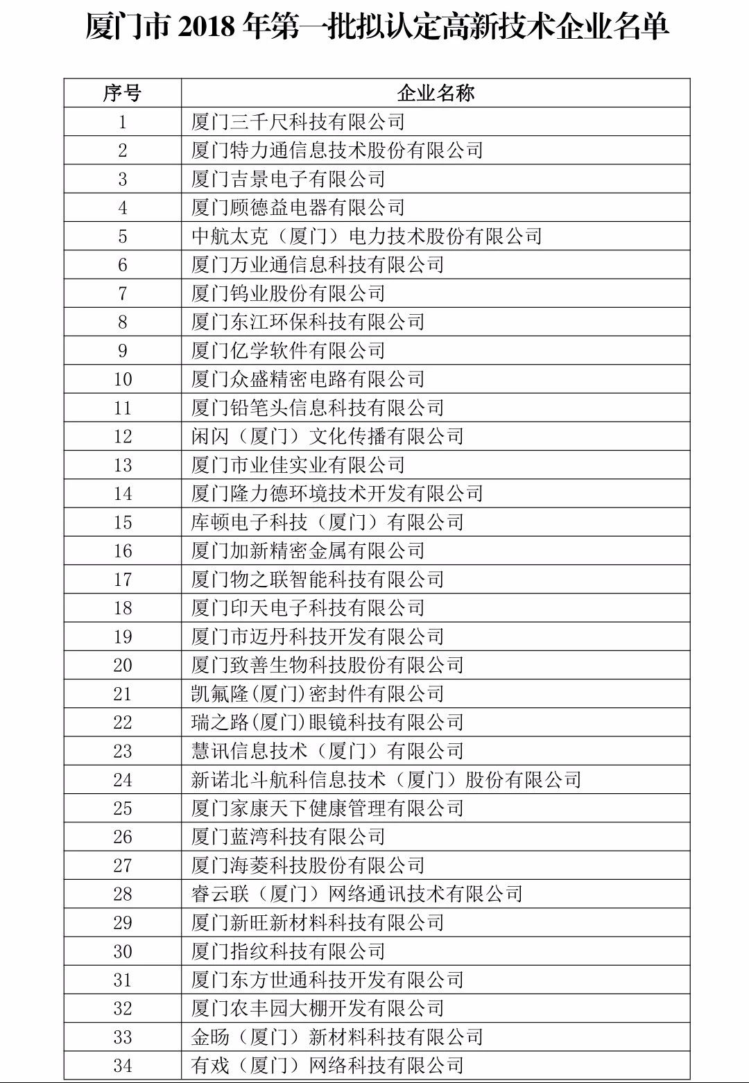 關于公示廈門市2018年第一批擬認定高新技術企業名單的通知