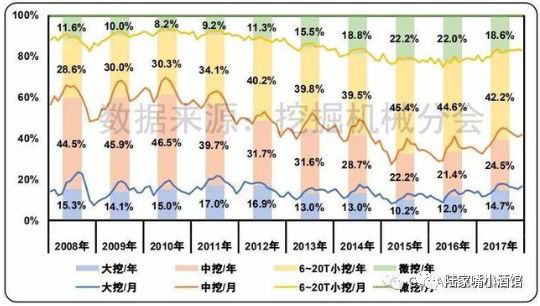 由于應用領域的差別,大噸位的挖掘機受投資和經濟周期影響大,而小噸位的受投資影響相對較小。2016年下半年開始的市場復蘇受多因素疊加驅動,其中投資增長為重要因素之一。因此,在此輪的市場復蘇行情中,中挖、大挖市場復蘇更為顯著,市場占比也有所提高。但長期來看,國內城鎮化水平提高和“機器代人”需求的不斷增長,小噸位挖掘機的市場占比仍有上升潛力。