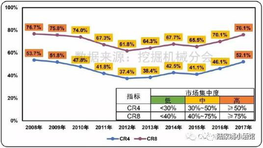 在2008年“四萬億”投資的拉動下,大量資本投資挖掘機械市場,主機廠商規模的增加加之“低首付、零首付”等極端信用銷售模式的實施,導致市場秩序惡化,市場集中度大幅下滑。